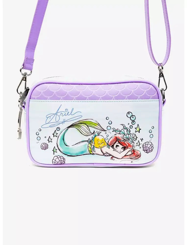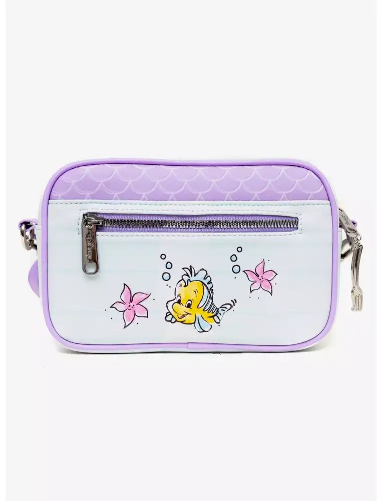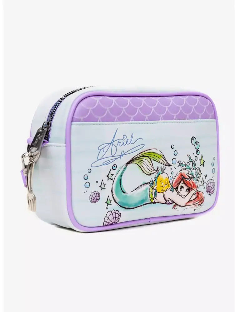 Introducing the Disney The Little Mermaid Ariel and Flounder Crossbody Bag! Dive into enchantment with this mermaid-themed makeup bag. The vibrant colors and intricate details make this bag a true work of art. Express your love for Disney with this unique and eye-catching accessory. Perfect for on-the-go magic! Measures 8" x 5.5" x 2.5"