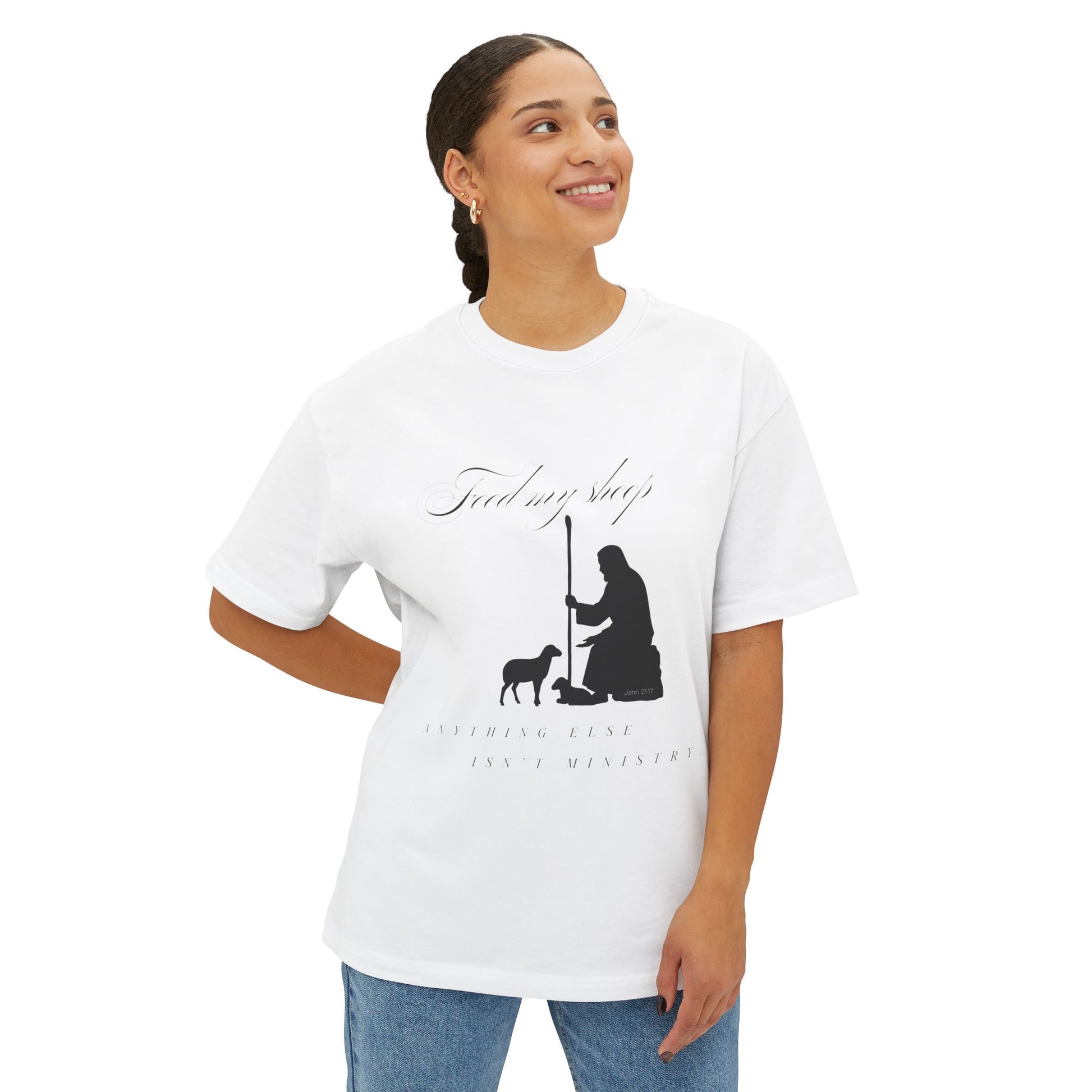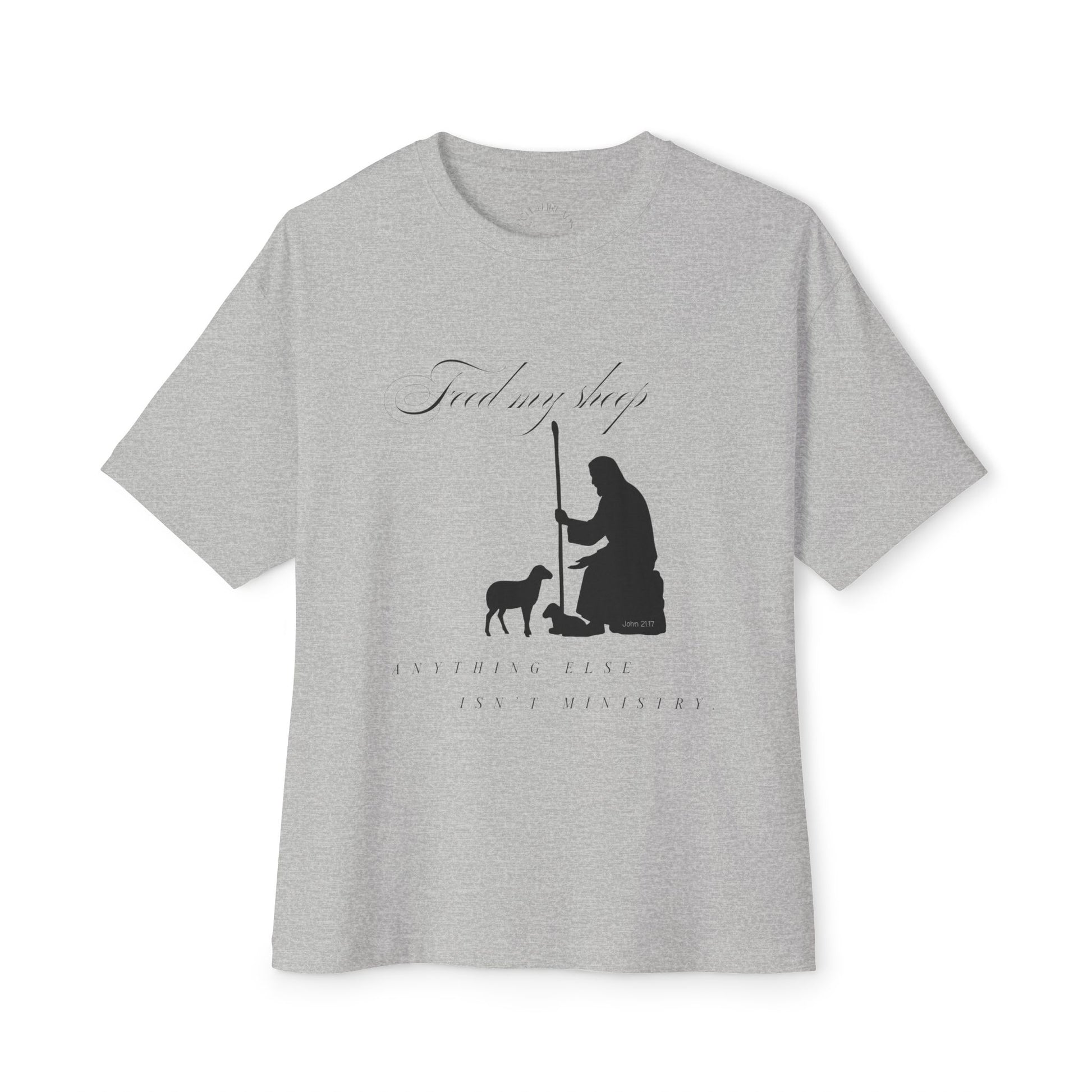 A soft, oversized tee with a calm, contemplative design — a shepherd kneeling to a small lamb in silhouette. The relaxed boxy cut drapes easily over layers or stands alone, offering a quiet, thoughtful look that reads like a gentle reminder of care and stewardship. Lightweight yet substantial, the cotton fabric breathes and wears in gracefully, while the muted artwork keeps the mood humble and heartfelt. Wear it on slow mornings, to volunteer shifts, or when you want clothing that speaks to quiet values rather than loud trends.