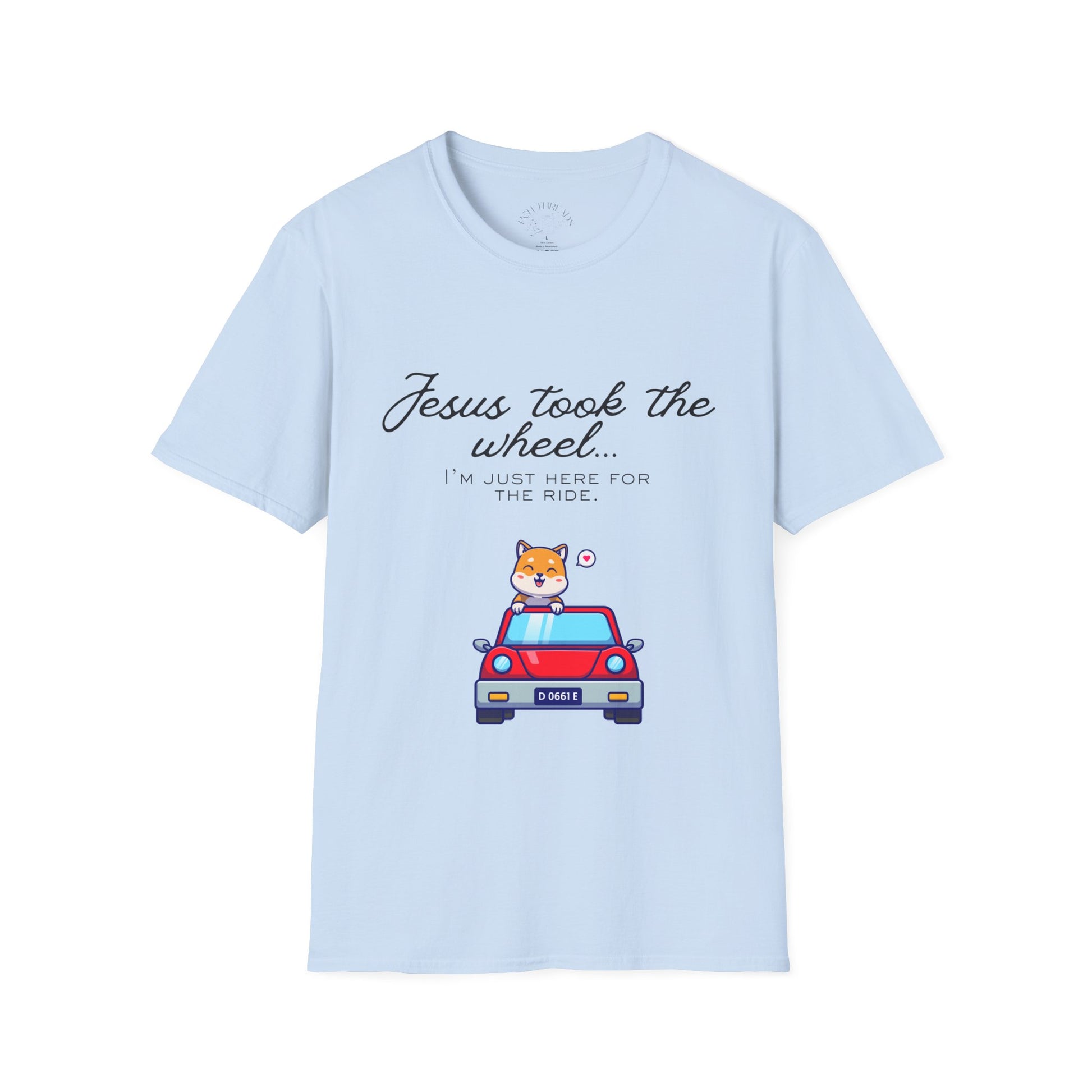 Soft, simple, and quietly joyful — this lightweight tee carries a gentle message with a playful illustration. A small, car sits beneath hand-lettered script that reads “Jesus took the wheel,” turning a familiar phrase into a calm reminder of trust and surrender. The breathable, smooth cotton feels effortless against skin, so the shirt becomes something you reach for on easy mornings, church outings, or casual days when you want your faith to be seen without shouting. It layers cleanly under a cardigan, pairs with jeans for errands, or slips on for road trips where the scenery and conversation are the focus. The design’s soft colors and minimal lines give it a humble, warm presence that fits into a thoughtful, faith-centered wardrobe.