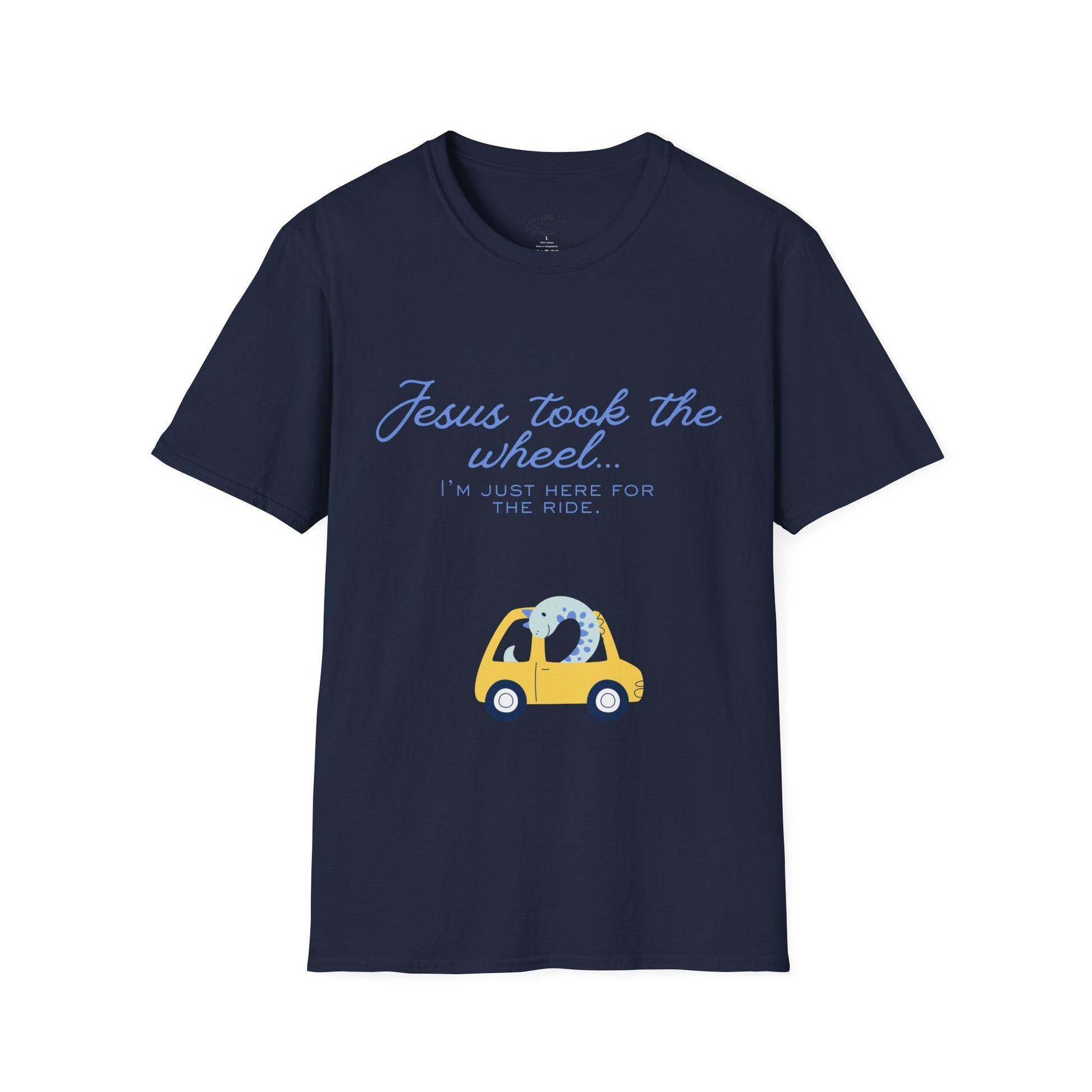 Soft, simple, and quietly joyful — this lightweight tee carries a gentle message with a playful illustration. A small, sunny car sits beneath hand-lettered script that reads “Jesus took the wheel,” turning a familiar phrase into a calm reminder of trust and surrender. The breathable, smooth cotton feels effortless against skin, so the shirt becomes something you reach for on easy mornings, church outings, or casual days when you want your faith to be seen without shouting. It layers cleanly under a cardigan, pairs with jeans for errands, or slips on for road trips where the scenery and conversation are the focus. The design’s soft colors and minimal lines give it a humble, warm presence that fits into a thoughtful, faith-centered wardrobe.