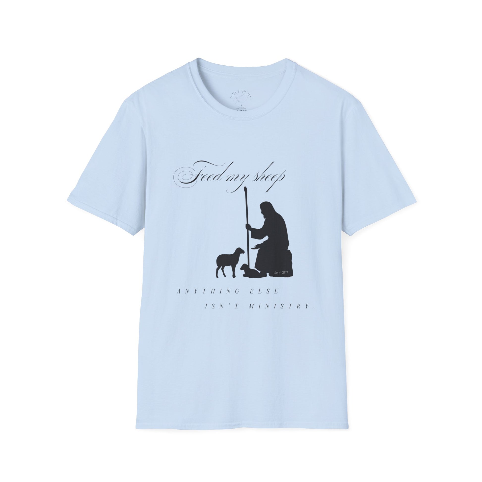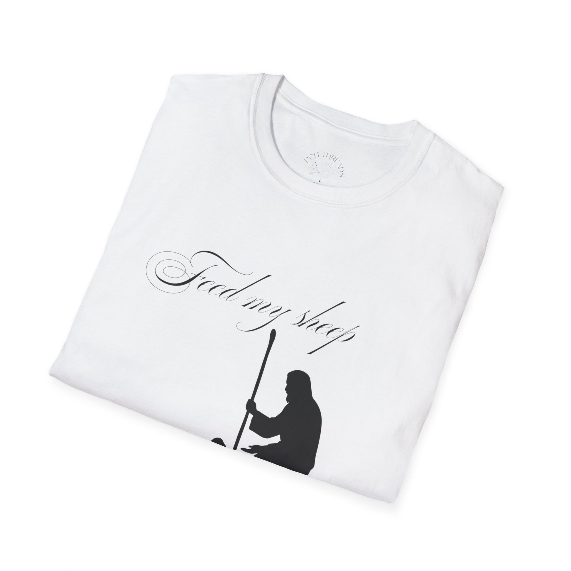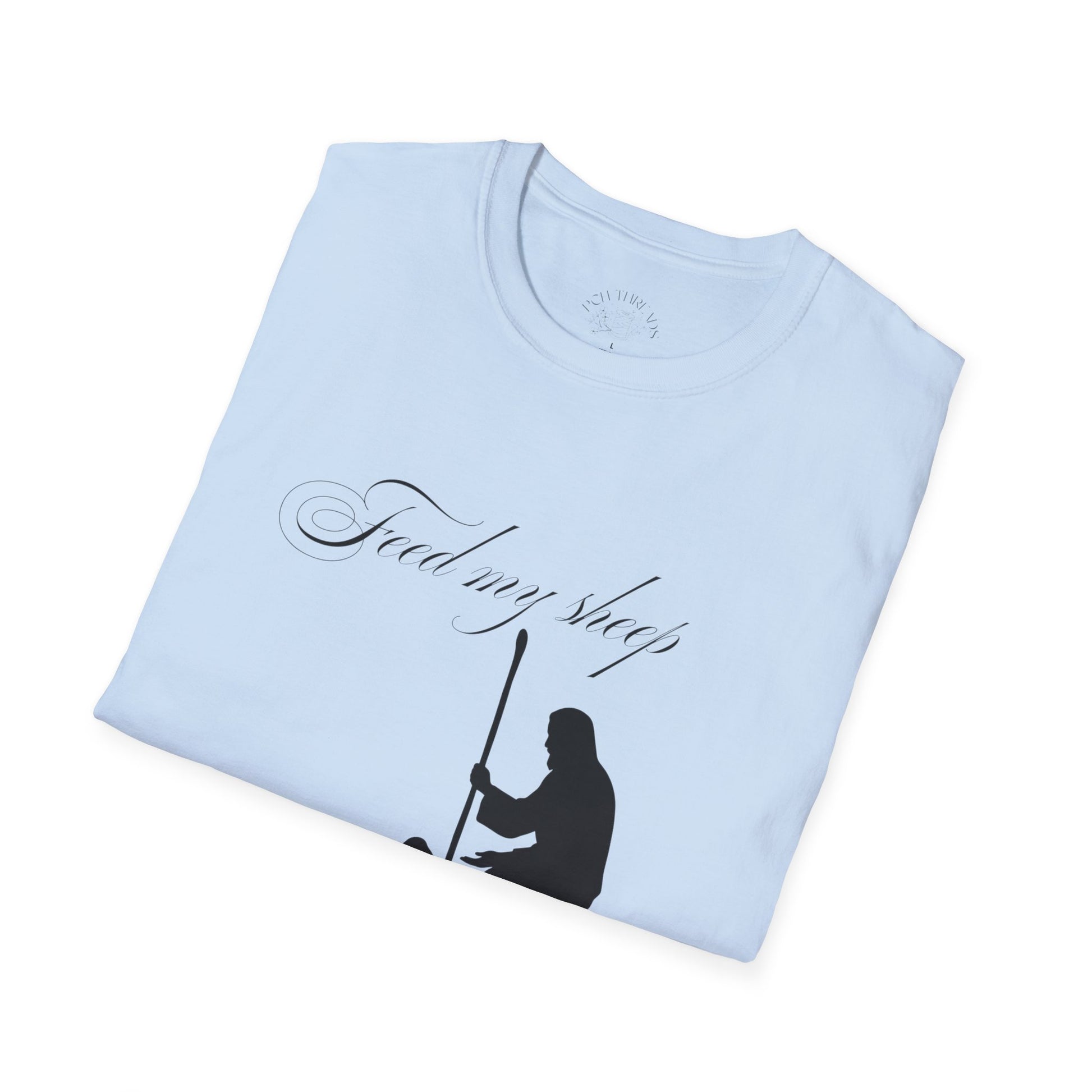 A soft, breathable tee that carries a quiet, contemplative message. The minimalist silhouette of a shepherd and lamb sits centered on a lightweight, ring-spun cotton shirt — simple artwork that reads like a small, personal reminder. Wear it layered under a cardigan for slow Sunday mornings or alone with jeans when you want an understated, thoughtful look. The shirt drapes easily, holds its collar shape, and feels smooth against the skin so the design remains the focus, not the fuss. It suits people who value calm, reflective style and subtle spiritual or pastoral motifs for gatherings like small church meetups, community retreats, or everyday moments of pause.
