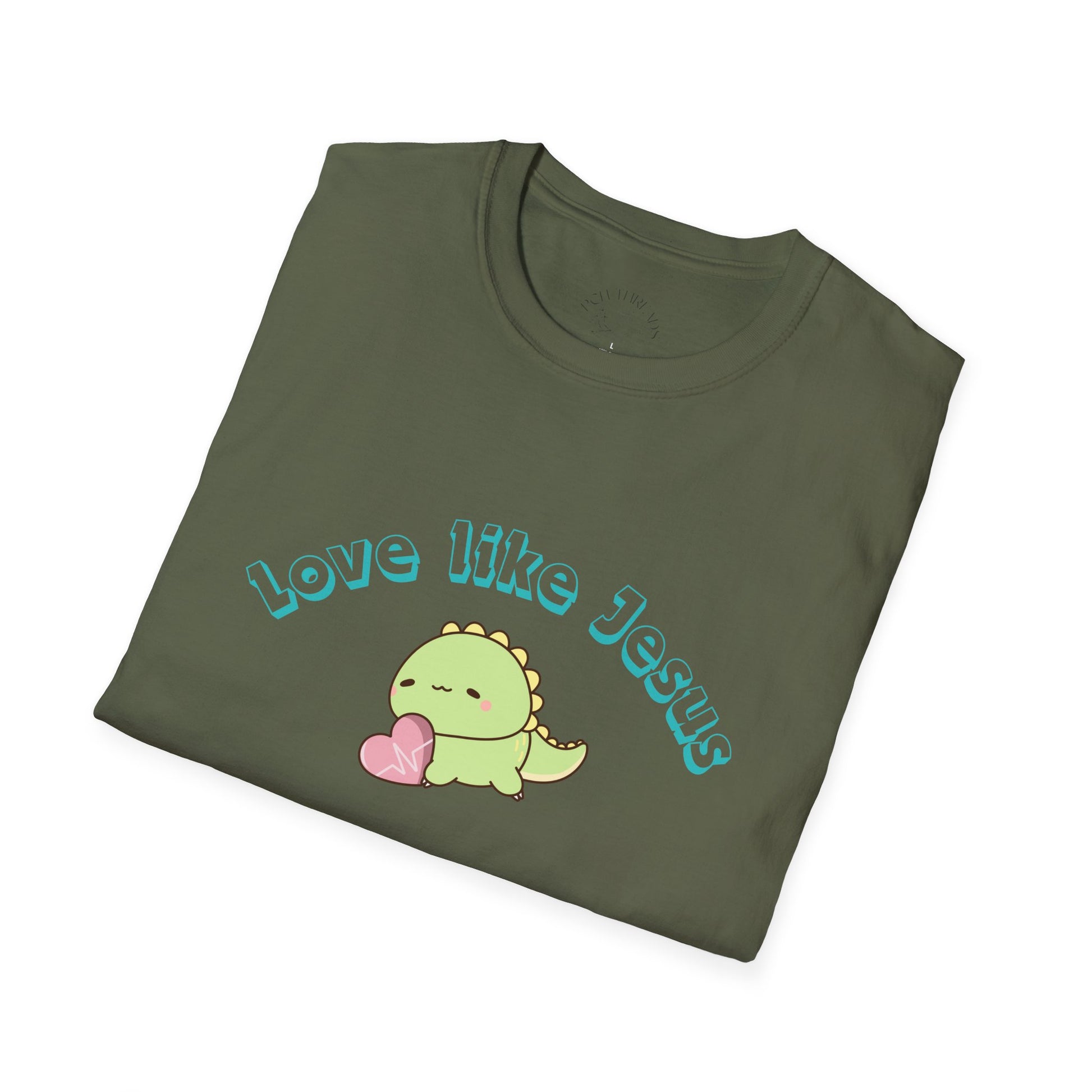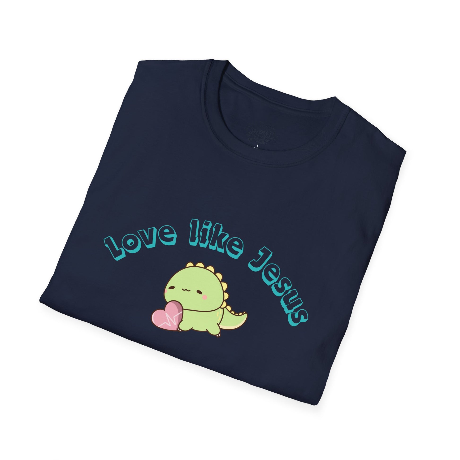 A soft, lightweight tee that spreads a little gentle joy. The front shows a pastel, hand-drawn-style dinosaur clutching a pink heart with the phrase “love like dinos” arched above and a cheeky line below: “even when they test you.” Short sentences, warm humor, and soft colors make this shirt feel like a comforting note from a friend. Wear it on slow mornings, study breaks, or lazy weekends — it sits comfortably under a jacket or on its own and keeps the mood light without shouting. The smooth ring-spun cotton and tear-away label keep it easy against skin, while durable printing methods keep the artwork soft and clear wash after wash.